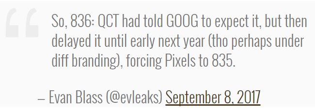 برای مدت قابل توجهی تمامی خبرهای منتشر شده در مورد نسل جدید از گوشیهای پیکسل گوگل نشان میدادند که این محصولات قرار است از تراشه جدیدی با نام اسنپدراگون 836 بهره ببرند. اما اکنون به نظر میرسد که عرضه این تراشهها به تعویق افتاده است.