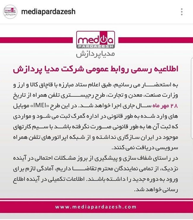 در بخشی از این اطلاعیه آمده است: "به استحضار میرسانیم، طبق اعلام ستاد مبارزه با قاچاق کالا و ارز و وزارت صنعت، معدن و تجارت، طرح رجیستری تلفن همراه از تاریخ 28 مهرماه سال جاری اجرا خواهد شد. در این طرح IMEI موبایلهای وارد شده به طور قانونی در اداره گمرک ثبت میشود و مواردی که ثبت آنها به طور قانونی صورت نگرفته باشد با سیم کارتهای موجود در ایران سازگاری نداشته و از شبکه اپراتورهای تلفن همراه سرویسی دریافت نمی کنند."