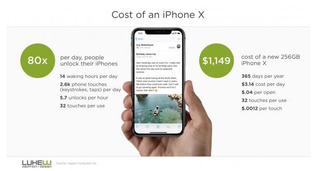 به تازگی یکی از کاربران Twitter، تصویر اینفوگرافیکی را منتشر کرده است که هزینه استفاده از نسخه 256 گیگابایتی از گوشی آیفون X را در هر روز و با هربار لمس آن محاسبه کرده است. براساس این تصویر اگر این نسخه از گوشی آیفون X در حدود یک سال روشن باقی بماند؛ کاربران باید برای استفاده روزانه از آن چیزی در حدود 3.14 دلار پرداخت کنند. این تصویر همچنین نشان میدهد که هربار بازکردن قفل این گوشی در حدود 0.4 دلار و همچنین هر لمس آن در حدود 0.0012 دلار هزینه دربر دارد.