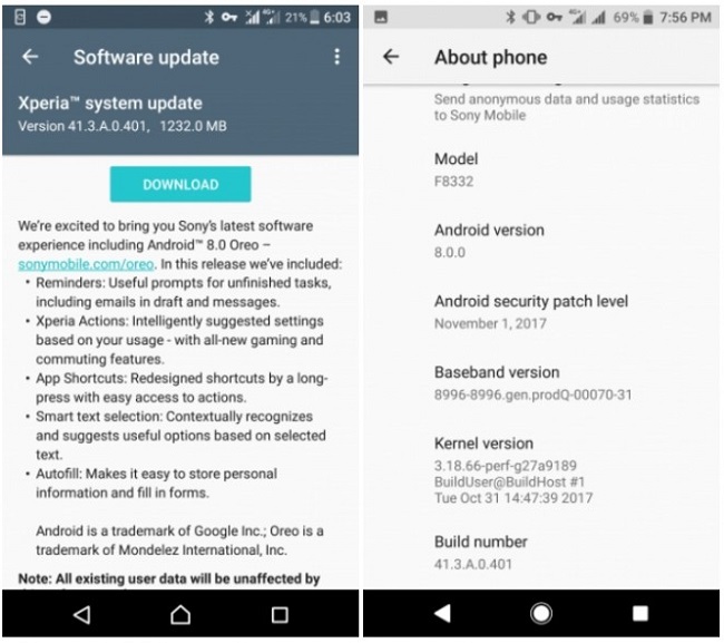سونی عرضه آپدیت ارتقا به اندروید 8.0 را برای Xperia XZ و Xperia XZs آغاز کرد. آپدیت ارتقا به اندروید 8.0 تحت شناسه ساخت (بیلد) 41.3.A.0.401 منتشر شده و حدود 1.2 گیگابایت حجم دارد. این آپدیت وصلههای امنیتی عرضه شده در ماه نوامبر را نیز با خود دارد. انتظار میرود به زودی این آپدیت برای Xperia X Performance منتشر شود.