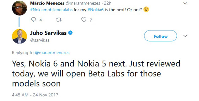 Juho Sarvikas سرپرست بخش محصولات HMD، در ادامه توییت خود مبنی بر انتشار بهروزرسانی Oreo برای نوکیا 8، در پاسخ به کاربری عنوان کرد که گوشیهای نوکیا 6 و نوکیا 5 هم، پس از نوکیا 8، بهروزرسانی اندروید Oreo را دریافت خواهند کرد. این بهروزرسانی ابتدا در مرحله آزمایشی بوده و پس از تست کاربران ثبتنام شده، برای انتشار رسمی آماده خواهد شد.