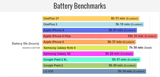در بررسیهای صورت گرفته توسط سایت Phonearena، مشخص شده است که باتری گوشی OnePlus 5T میتواند با هر بار شارژ در حدود 8 ساعت و 51 دقیقه دوام بیاورد. از این نظر میتوان این شارژدهی را مشابه با گوشی Google Pixel 2 XL دانست و آن را کمی بهتر از شارژدهی گوشی نوت 8 با صفحه نمایش OLED معرفی کرد. نتایج بدست آمده در این بررسی و مقایسه آن با دیگر گوشیهای پرچمدار را میتوانید در زیر مشاهده کنید.