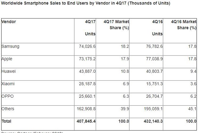 گارتنر میگوید برای اولین بار از سال 2014 فروش گوشیهای موبایل در فصل چهارم سال میلادی 2017 کاهش یافته است و در نتیجه آن حجم عرضه سامسونگ و اپل با افت همراه بوده است.