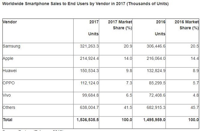 هواوی با فروش 43.8 میلیون گوشی موبایل، 10.8 درصد بازار را اختیار دارد که نسبت به 40.8 میلیون دستگاه در سال 2016، رشد قابل ملاحظه را نشان میدهد. شیائومی نیز توانسته فروش خود را از 15.7 میلیون به 28.1 میلیون دستگاه برساند و 6.9 درصد بازار را در اختیار خود دارد.