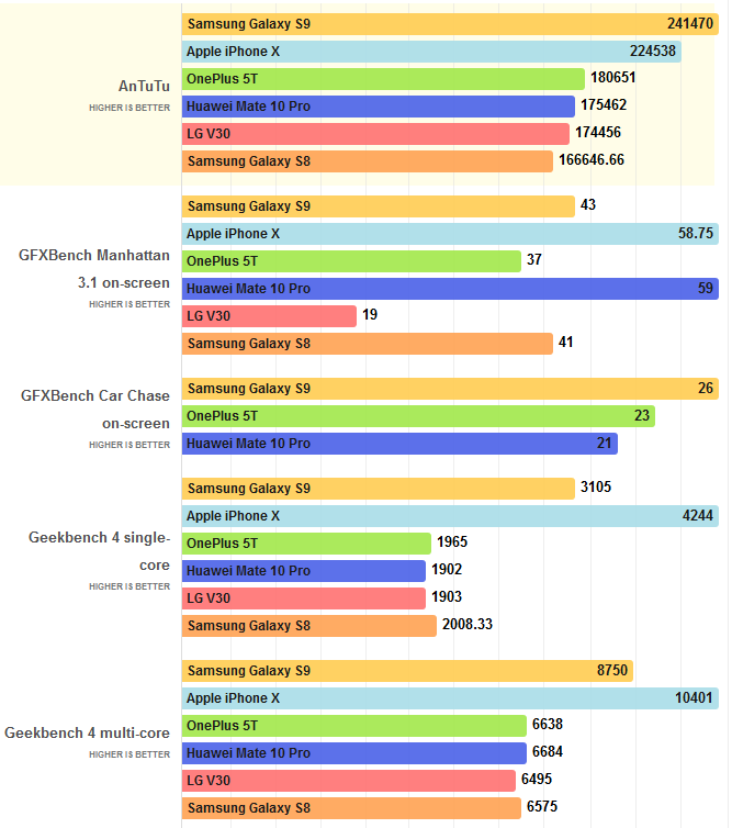 نمودار فوق امتیاز کسب شده توسط Galaxy S9 در بنچ مارکهای AnTuTu ،GFXBench و Geekbench 4 را نشان میدهد، هرچند نتایج خیره کننده هستند، اما بعید نیست کارایی نسخه نهایی از این بهتر هم باشد. در هر صورت کارایی Galaxy S9 از تمامی گوشیهای موجود جز Phone X بالاتر است. S9 جایگاه شماره یک بنچمارک AnTuTu را تصاحب کرده است.