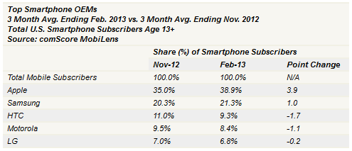 HTC از سهم 11.0% به 9.3% ، موتورولا از سهم 9.5% به 8.4% و LG نیز از سهم 7.0% به 6.8% سقوط داشته اند و به ترتیب رتبه های سوم تا پنجم بازار ایالات متحده را تشکیل داده اند .