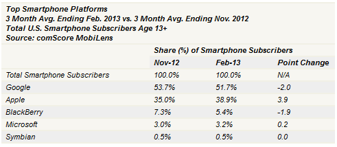 در بازار ایالات متحده 133.7 میلیون کاربر تلفن همراه وجود دارد که از این مقدار 57% آنها صاحب یک اسمارت فون هستند که این مقدار نسبت به مقدار مشابه 3 ماه پیش حدود 8 درصد رشد را نشان می دهد ، حال بیاییم این مقدار را بر اساس استفاده از سیستم عامل ها و برند ها تفکیک کنیم .