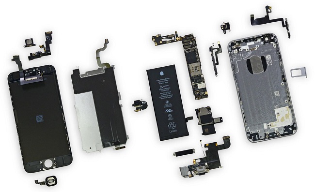 نکته بسیار جالب اینجاست که بنری که HTC در آن وعده تاریخ قطعی رونمایی از مدل U12 را داده است، متشکل از قطعات تفکیک شده شامل بورد اصلی، ماژولهای دوربین، باتری و ... از آیفون 6 است! عکس زیر ند سال پیش بعد از جداسازی تمامی اجزاء گوشی آیفون 6 توسط وبسایت مشهور iFixit گرفته شده است: