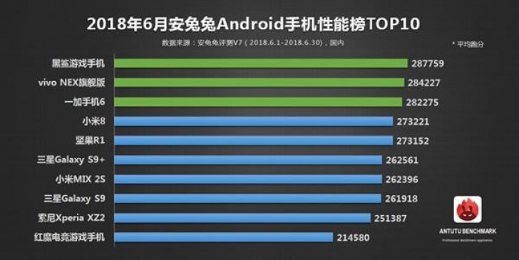 رتبه اول این لیست به گوشی گیمینگ عرضه شده توسط شیائومی یعنی Black Shark با امتیاز 287759 تعلق دارد و گوشی به تازگی معرفیشدهی Vivo Nex S که بیشتر با نوآوری ماژول متحرک دوربین سلفی و نمایشگر تمام صفحه خود شناخته میشود با اندکی اختلاف و امتیاز 284227 در جایگاه دوم قرار دارد. سکوی سوم نیز متعلق به گوشی شناختهشدهی OnePlus 6 با امتیاز 282275 است.