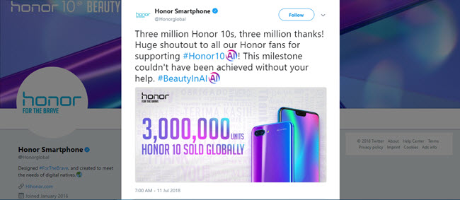 یک ماه پس از معرفی Honor 10 در تاریخ 15 می در لندن، آنر اعلام کرد که در این یک ماه موفق شدهاند تا یک میلیون عدد از این دستگاه را بفروشند. و امروز کمتر از دوماه پس از معرفی این دستگاه آنر اعلام کرده است که توانسته است تا 3 میلیون عدد Honor 10 را تا امروز به فروش برساند!