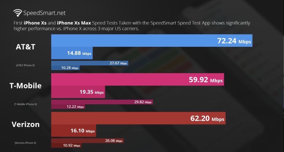 سرویس تست سرعت SpeedSmart امروز نتایجی را از مقایسه سرعت شبکه LTE آیفون XS و XS Max با آیفون 10 منتشر کرده است که در آن شاهد افزایش چشمگیر سرعت شبکه LTE در آیفون های جدید هستیم.