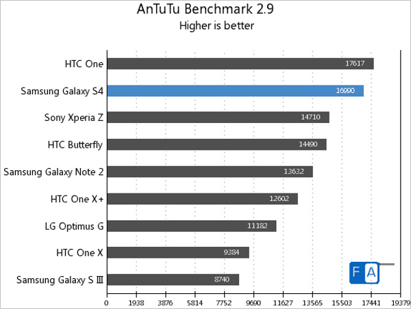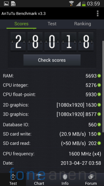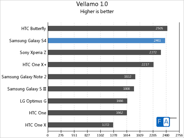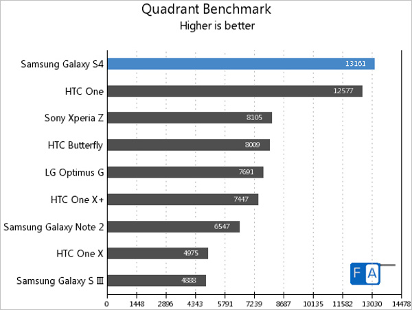 در عکسهای زیر نتایج مربوط به تست های Quadrant ، AnTuTu ، Vellamo و GLBenchmark را مشاهده می کنید ، نکته جالب اینکه گلکسی اس 4 با چیپست اگزینوس در تست Antutu نسخه 2.9 از HTC One عقبتر است اما در نسخه 3.3 و امتیاز 28018 با اختلاف زیادی از HTC One که امتیاز 24259 را در اختیار دارد جلو افتاده است .