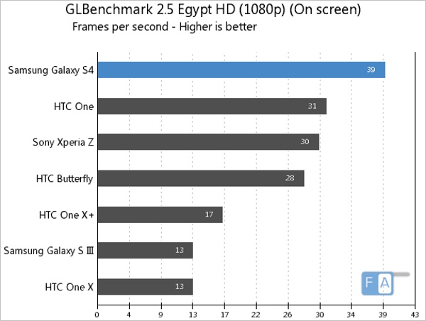 همچنین در تست گرافیکی GL Benchmark به لطف پردازشگر گرافیکی PowerVR SGX544MP3 در سرعت کلاک 533 مگاهرتز توانسته به نرخ فریم 39 دست یابد .