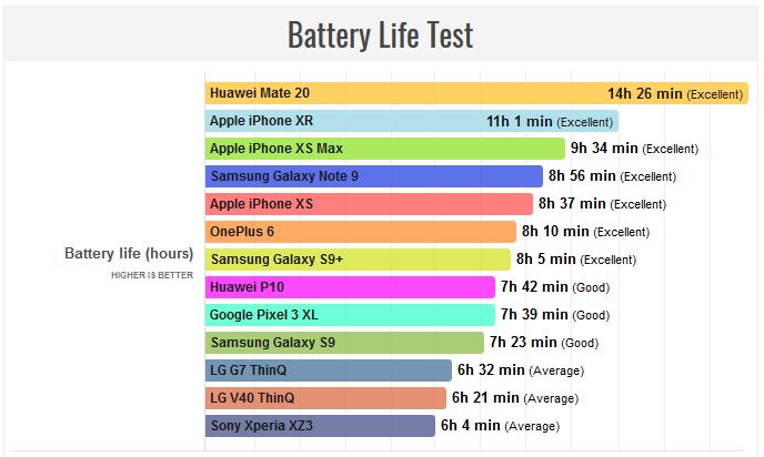 همانطور که مشاهده میکنید گوشی هواوی میت 20 با استفاده از یک چیپست کیرین 980 با لیتوگرافی ساخت 7 نانومتری و بهرهگیری از باتری 4000 میلیآمپر ساعتی و همچنین مدیریت حداکثری در مصرف انرژی نمایشگر توانسته امتیاز باورنکردنی 14 ساعت و 26 دقیقه را کسب کند. رتبه دوم هم مربوط به گوشی (نسبتاً) مقرون به صرفه اپل iPhone XR است که با 11 ساعت و 1 دقیقه شارژدهی بهترین عملکرد را بعد از میت 20 دارد.