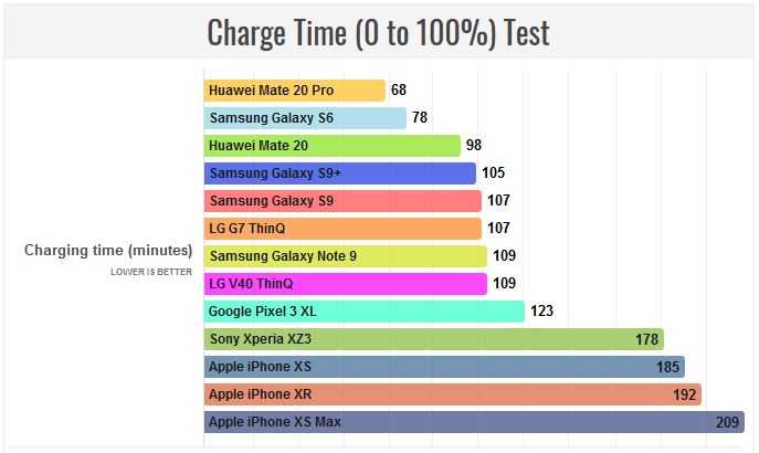 نکته بسیار قابل توجه در مورد تست شارژ باتری عملکرد بسیار ضعیف باتری گوشیهای اپل است که همگی بیشتر از 3 ساعت کامل زمان نیاز دارند تا شارژ شوند و در مقابل گوشیهای اندرویدی و به خصوص سری میت 20 زمان شارژ بسیار کوتاه و نزدیک به یک ساعت دارند. در واقع سالیان زیادی است که کاربران به مدت زمان بسیار زیاد برای شارژ شدن گوشیهای اپل اعتراض دارند ولی این شرکت بنا به دلایل نامعلومی استفاده از فناوریهای شارژ سریع در دستگاههای خود را شروع نکرده است.
