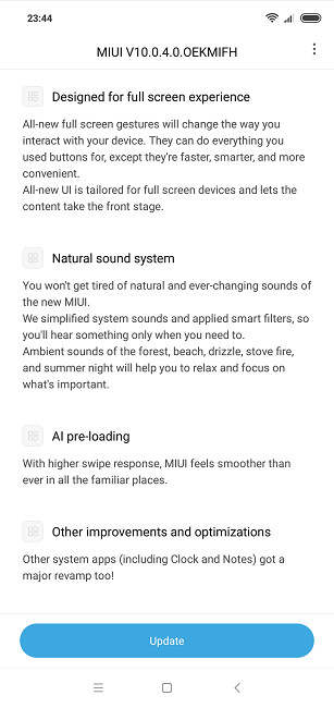 آپدیت MIUI 10 تحت بیلدنامبر V10.0.0.4.0.OEKMIFH برای گوشی Redmi Note 6 Pro منتشر شده و 1.6 گیگابایت حجم دارد. این آپدیت از طریق خود گوشی و همچنین فایل ZIP آن از طریق وب سایت MIUI قابل دریافت است. یکی از بزرگترین تغییرات MIUI 10، اضافه شدن سیستم پیمایش مبتنی بر Gesture یا همان حرکتهای لمسی است که میتواند جایگزین دکمههای مجازی شود. همچنین شیائومی خود میگوید حالا رابط کاربری MIUI از هوش مصنوعی برای افزایش سرعت پاسخدهی بهره میگیرد. همچنین با نصب این آپدیت، وصله های امنیتی گوگل تا اول اکتبر 2018 نیز نصب می شود.