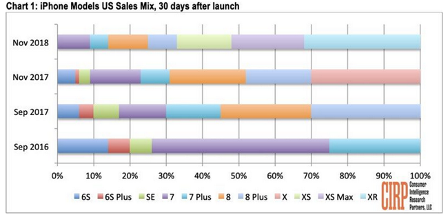 ماه گذشته آیفون XR موفق شد تا 32% از سهم فروش گوشیهای هوشمند برند اپل در بازار آمریکا را به خود اختصاص دهد؛ همچنین نسخههای گران قیمت XS و XS Max در مجموع نزدیک به 35% فروش ماه قبل را به خود اختصاص داده بودند. همچنین در آمار منتشر شده میزان فروش نسخه قدیمی آیفون X حدود 30% و نسخه آیفون 8 و 8 پلاس نیز 39% اعلام شده است.
