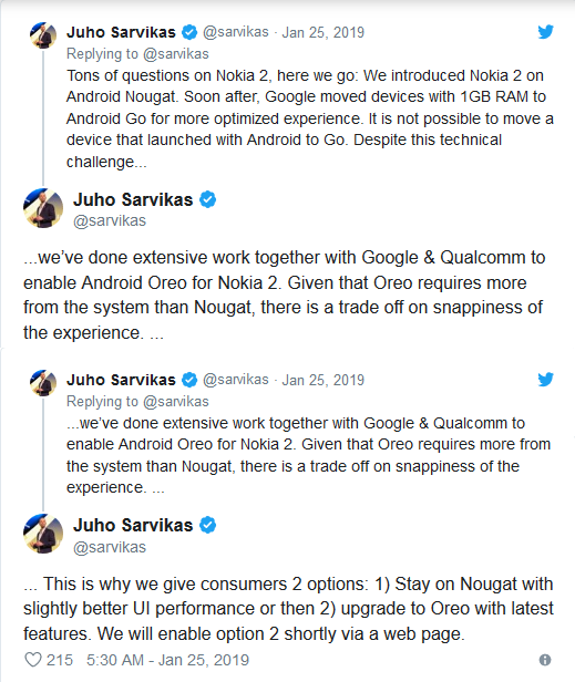 به گفته مدیران نوکیا، این بروزرسانی به زودی در اختیار کاربران قرار خواهد گرفت. پیش از این تیم نوکیا قول داده بود که بروزرسانی اندروید 8.1 را به همراه قابلیت ویژه کنترل فضای حافظه رم برای گوشی نوکیا 2 عرضه میکند. تا این لحظه مشخص نیست که بروزرسانی پیش رو برای نوکیا 2.1، شامل نسخه اندروید 8 میشود یا که نوکیا قصد دارد از اندروید 8.1 استفاده کند.