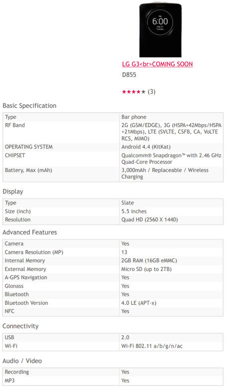 در وبسایت LG U.K بعضی از مشخصات جی3 هم تایید شده است از جمله صفحه نمایش 5.5 اینچی QHD با رزولوشن 2560 در 1440، پردازنده 4 هسته ای اسنپدراگون 801 با فرکانس 2.46 گیگاهرتز، دوربین 13 مگاپیکسلی و باتری 3000 میلی آمپر ساعتی. این گوشی از نسخه 4.4 سیستم عامل اندروید به نام کیت کت بهره می برد. این وبسایت میزان رم جی3 را 2 گیگابایت اعلام کرده است در صورتی که شنیده می شد که جی3 مجهز به 3 گیگابایت رم خواهد بود.