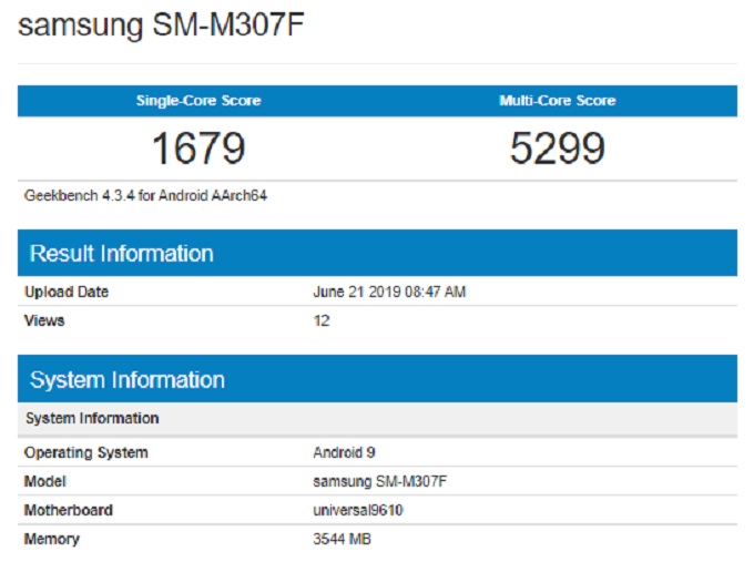 حال به تازگی مشخصات اولیه این میان رده در بنچمارک Geekbench با شماره مدل SM-M307F به ثبت رسیده است. در این بنچمارک میان رده گلکسی M30s با تراشه اگزینوس 9610 ظاهر شده است و از اندروید 9 پای به عنوان سیستم عامل خود استفاده میکند، در حالی که نسخه گلکسی M30 از اندروید 8 استفاده میکند و فعلاً بروزرسانی اندروید 9 را دریافت نکرده است.