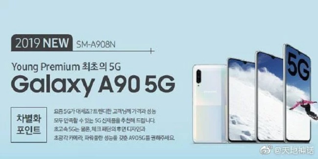 در پوستر تبلیغاتی لو رفته از میان رده گلکسی A90 5G، شمار مدل آن SM-A908N ذکر شده است. رندرهای منتشر شده طراحی قسمت پشتی و جلویی این دستگاه را به نمایش میگذارند و همانطور که در تصاویر منتشر شده مشاهده میکنید، برخلاف نسخه A80، در این نسخه از دوربین سلفی چرخنده استفاده نشده است و سامسونگ برای قرار دادن دوربین سلفی در این میان رده از بریدگی ناچ قطرهای استفاده کرده است.