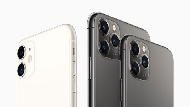 مدل پایه iPhone 11 دارای دوربین دو تایی 12 مگاپیکسلی است اما دو مدل Pro از دوربین سه تایی جدید با حسگرهای 12 مگاپیکسلی بهره می برند. دوربین اصلی داری لنز 26 میلی متری f/1.8، لرزش گیر اپتیکال و فوکوس خودکار Dual Pixel است. لنز تله فتو همان 52 میلی متری نسل قبل با توانایی بزرگ نمایی دوبرابری باقی مانده اما داری گشودگی دیافراگم روشن تر f/2.0 و همچنین لرزش گیر و فوکوس خودکار مشابه دوربین اصلی است.