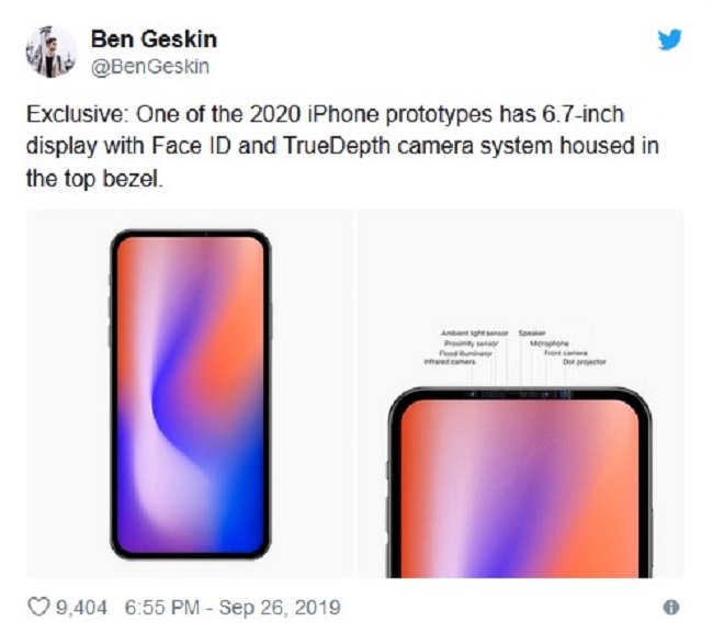 در این تصویر شاهد یک گوشی آیفون با صفحه نمایش یک دست هستیم که به گفته Ben Geskin به صفحه نمایش 6.7 اینچی مجهز شده است و سنسورهای دوربین سلفی و تشخیص چهره آن در حاشیه نازک قسمت بالایی صفحه نمایش قرار گرفتهاند. در تصویر دوم شاهد ترتیب چینش سنسورها در حاشیه بالایی صفحه نمایش آیفون 2020 هستیم که به شکل فشردهای در کنار یکدیگر قرار گرفتهاند.