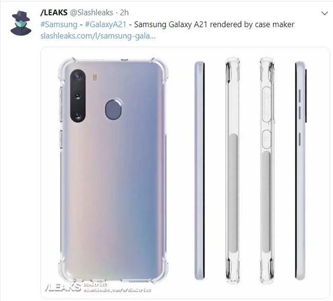 در رندر دوم میان رده گلکسی A21 را مشاهده میکنیم که مانند نسخه A20s به دوربین سه گانه و سنسور اثر انگشت فیزیکی مجهز شده است. به گفته منابع معتبر، این دو میان رده اقتصادی به صفحه نمایش Infinity با بریدگی V شکل برای قرار دادن دوربین سلفی مجهز شدهاند. البته باید در نظر داشت که این رندرهای توسط یک تولید کننده قاب محافظ منتشر شده است و بدون شکل در طراحی محصول نهایی تغییرات بسیاری اعمال خواهد شد.