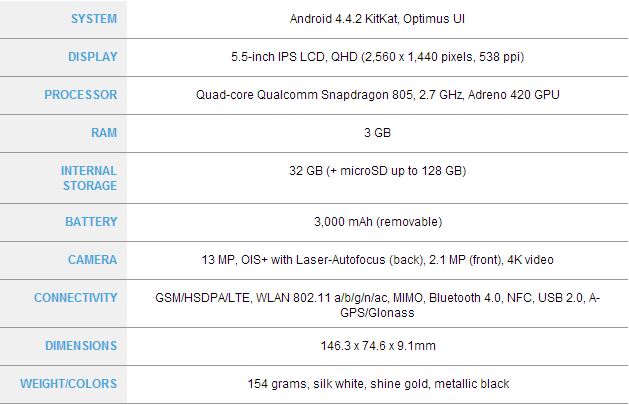 LG G3 Cat 6 در کره جنوبی به لطف مودم Qualcomm Gobi 9x35 Category 6 LTE-A از downlink با سرعت 225 مگابیت در ثانیه بهره مند خواهد بود. در جدول زیر میتوانید مشخصات این اسمارت فون را به صورت کامل مشاهده کنید: