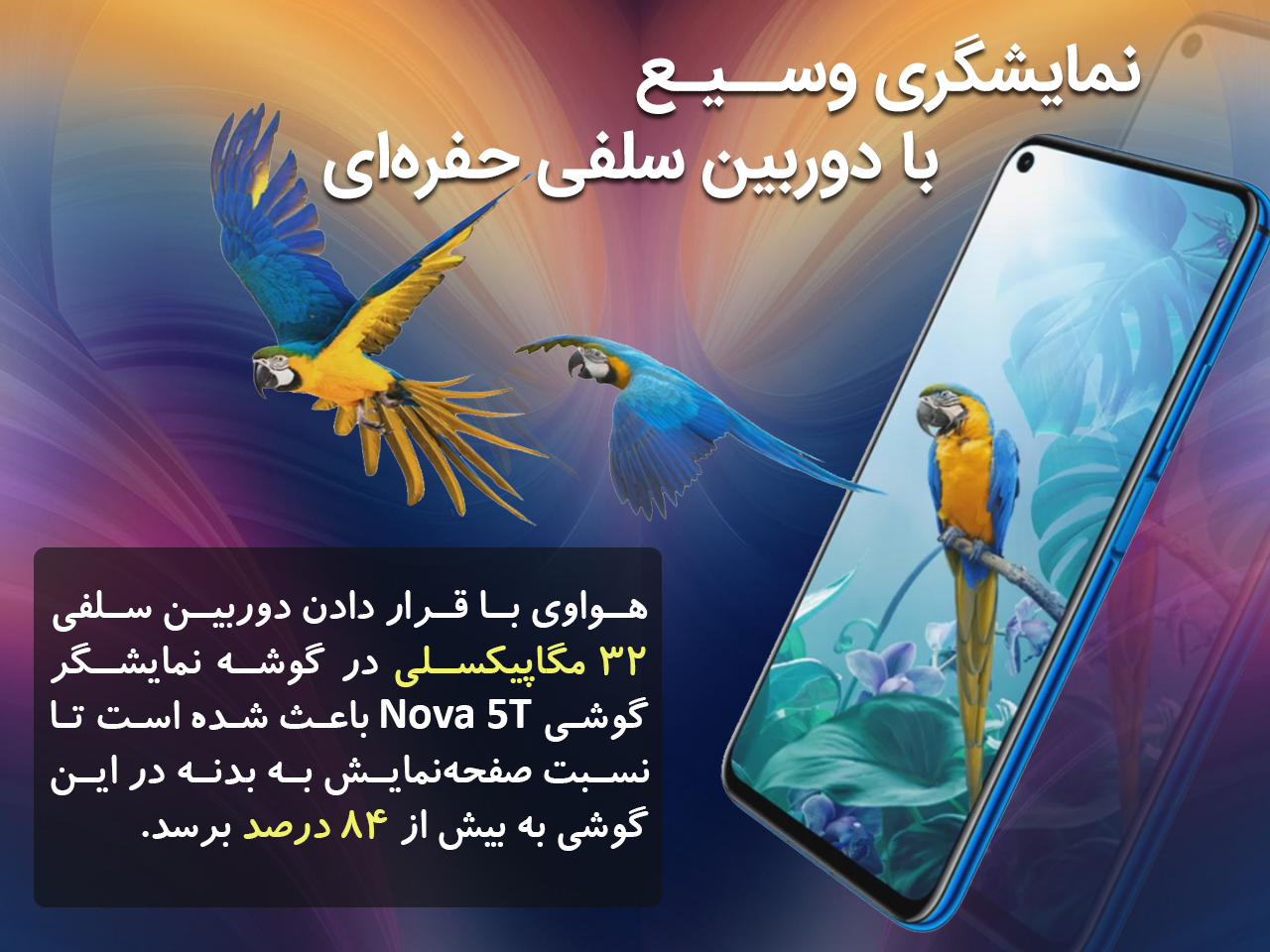 شرکت هواوی در این گوشی Nova 5T از صفحه نمایش 6.26 اینچی FHD+ استفاده کرده است؛ همچنین دوربین سلفی 32 مگاپیکسلی Nova 5T با استفاده از بریدگی نقطهای در گوشه نمایشگر قرار گرفته و باعث شده است تا نسبت صفحهنمایش به بدنه در این گوشی به بیش از 84 درصد برسد.