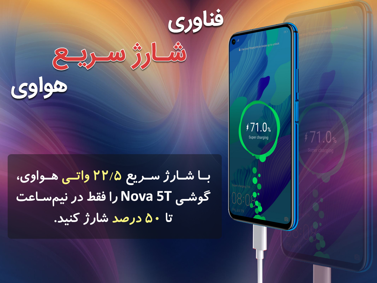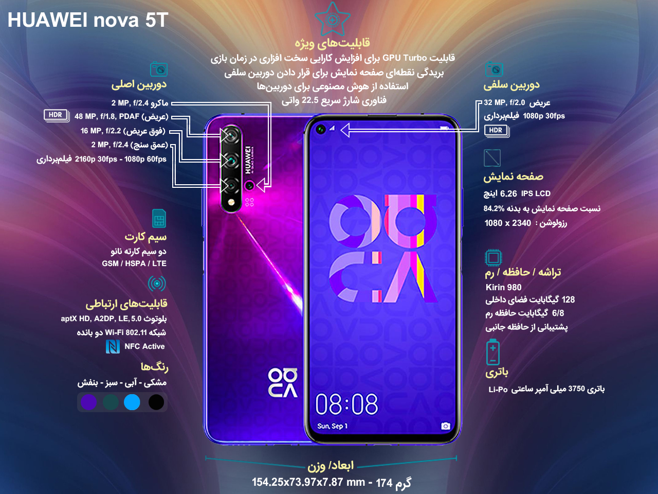 در حال حاضر گوشی Nova 5T به رابط کاربری EMUI 9.1 بر پایه اندروید 9 مجهز شده است، اما به زودی بروزرسانی رابط کاربری EMUI 10 بر پایه اندروید 10 را دریافت میکند. این گوشی جذاب در رنگهای مشکی، سبز، آبی و بنفش به بازار عرضه شده است و در حال حاضر در بازار کشور ما قیمت نسخه مجهز به حافظه رم 6 گیگابایتی 5 میلیون و 200 هزارتومان و قیمت نسخه مجهز به حافظه رم 8 گیگابایتی 5 میلیون 600 هزارتومان است.