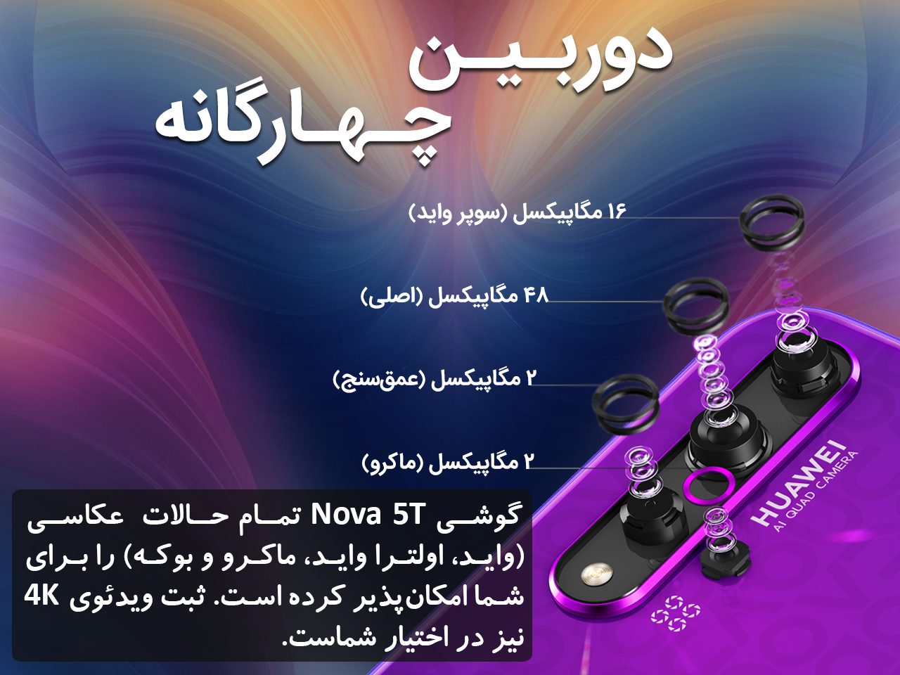 در قسمت پشتی Nova 5T شاهد استفاده از یک ماژول دوربین سه گانه هستیم که سنسور ماکرو خارج از ماژول و در کنار آن نصب شده است. این ماژول سه گانه به سنسورهای 16 مگاپیکسلی فوق عریض، 42 مگاپیکسلی اصلی، 2 مگاپیکسلی عمق سنج مجهز شده است؛ همچنین سنسور ماکرو آن از نوع 2 مگاپیکسلی است. گوشی Huawei Nova 5T تمام حالات عکاسی ( واید، اولترا واید، ماکرو و بوکه) را برای شما امکانپذیر کرده و قابلیت فیلمبرداری 4K را در اختیار شما قرار میدهد.