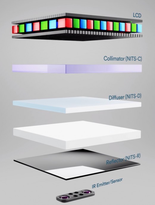 در فناوری سیستم انتقال نزدیک مادون قرمز (NITS) شرکت 3M یک فیلم نوری بسیار نازک با ابعاد میکرومتری در پشت صفحه نمایش LCD قرار میگیرد و استفاده از سنسور اثر انگشت نوری را ممکن میسازد. فیلمهای نوری نصب شده بر روی صفحه نمایشهای LCD قدیمی مانع از انتقال نور برای سنسور اثر انگشت زیر صفحه نمایش میشدند، به همین دلیل امکان تشخیص اثر انگشت کاربر وجود نداشت.