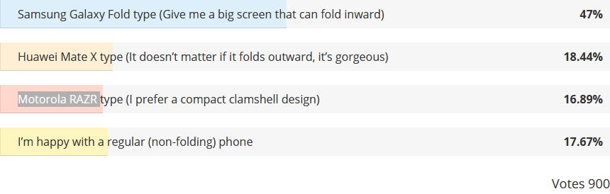 در کمال تعجب گوشیهای هوشمند استاندارد کمترین امتیاز را از کاربران وبسایت phonearena دریافت کردند و 47 درصد از کاربران خواهان طراحی مشابه گوشی Galaxy Fold سامسونگ با مکانیزم تاشو کتابی و صفحه نمایش بزرگ بودند. سامسونگ برای تکامل طراحی گلکسی فولد و افزایش مقاومت صفحه نمایش آن با چالشهای بسیار زیادی مواجه است، اما به نظر میرسد که با تمام مشکلات موجود، کاربران طراحی تاشو گلکسی فولد را به سایر نسخههای ترجیح میدهند.