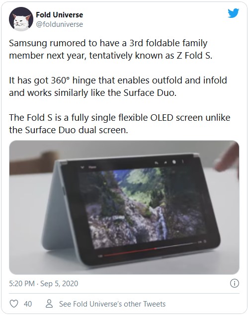 با وجود تمام تفاوتهای موجود برخی از کاربران گوشیهای تاشو Galaxy Z Fold 2 و سرفیس Duo مایکروسافت را با یکدیگر مقایسه میکنند. حال در همین راستا شایعههایی منتشر شده که در آن به عرضه گوشی تاشو سامسونگ Galaxy Z Fold S با لولا 360 درجه به منظور مقابله با سرفیس Duo مایکروسافت اشاره دارد.