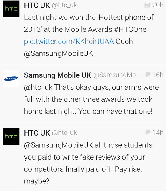 پس از آنکه HTC در صفحه اکانت توییتر خود برنده شدن جایزه Hottest Phone of 2013 را به طرفداران تبریک گفت سامسونگ نیز بیکار ننشسته و به طعنه گفته است که خود نیز سه جایزه در همان شب برده است و HTC می تواند همان یکی را برای خود نگه دارد !