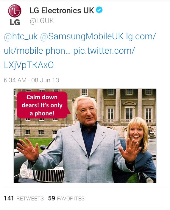 HTC نیز در پاسخ به این حرف سامسونگ به یادآوری رشوه دادن سامسونگ به دانش آموزان پرداخته که با دریافت پول از سامسونگ به نوشتن نقد های جعلی می پرداختند تا از سامسونگ طرفداری کنند ! اما ظاهراً فقط سامسونگ و HTC نیستند که اینجور لحظات شادی را در توییتر فراهم می کنند ! ال جی نیز در پاسخ به صحبت های بالا جواب جالبی داده است که دو طرف را به آرامش دعوت کرده است .