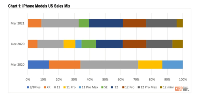 در حالیکه کوچکترین عضو خانواده برای جذب مشتری تقلا میکند، برادران بزرگترش وضعیت بسیار خوبی داشتهاند. برای مثال آیفون ۱۲ پرو مکس ۲۰ درصد از سهم فروش آیفونها را در اختیار دارد و دو برادر دیگر هم در کنار برادر بزرگتر قرار دارند.