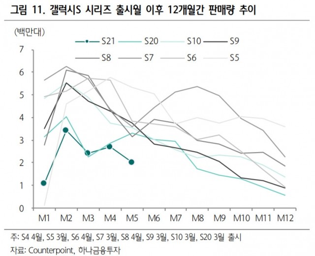 در ادامه این گزارش نموداری از فروش پرچمداران سامسونگ از سری گلکسی اس 5 تا سری اس 21 آمده که بر اساس آن سری جدید پرچمدار سامسونگ در ماه اول به تنهایی ۵٩٠ هزار دستگاه در کره جنوبی فروش داشته که بیشترین میزان فروش پس از سری S8 با ۶٢٠ هزار دستگاه محسوب میشود.
