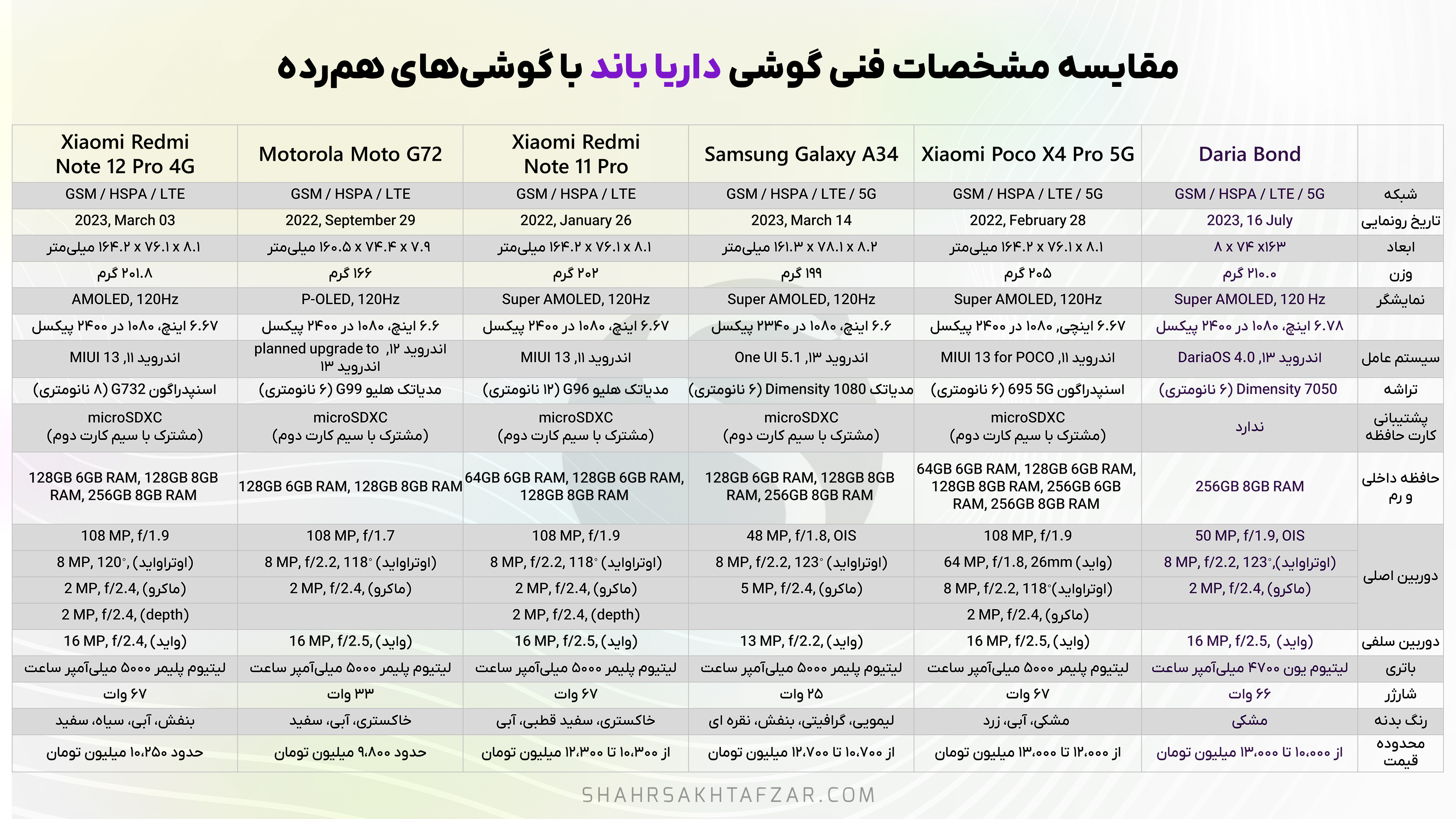 در این مطلب به مقایسه موبایل داریا باند با چند گوشی هوشمند میان رده از برندهای دیگر شامل گوشیهای Galaxy A34 Redmi Note 11 Pro و Poco X4 Pro و Motorola Moto G72 و Redmi Note 12 Pro 4G خواهیم پرداخت و در ادامه به سراغ بررسی تفاوت گوشی داریا باند با محصولات همرده میرویم.