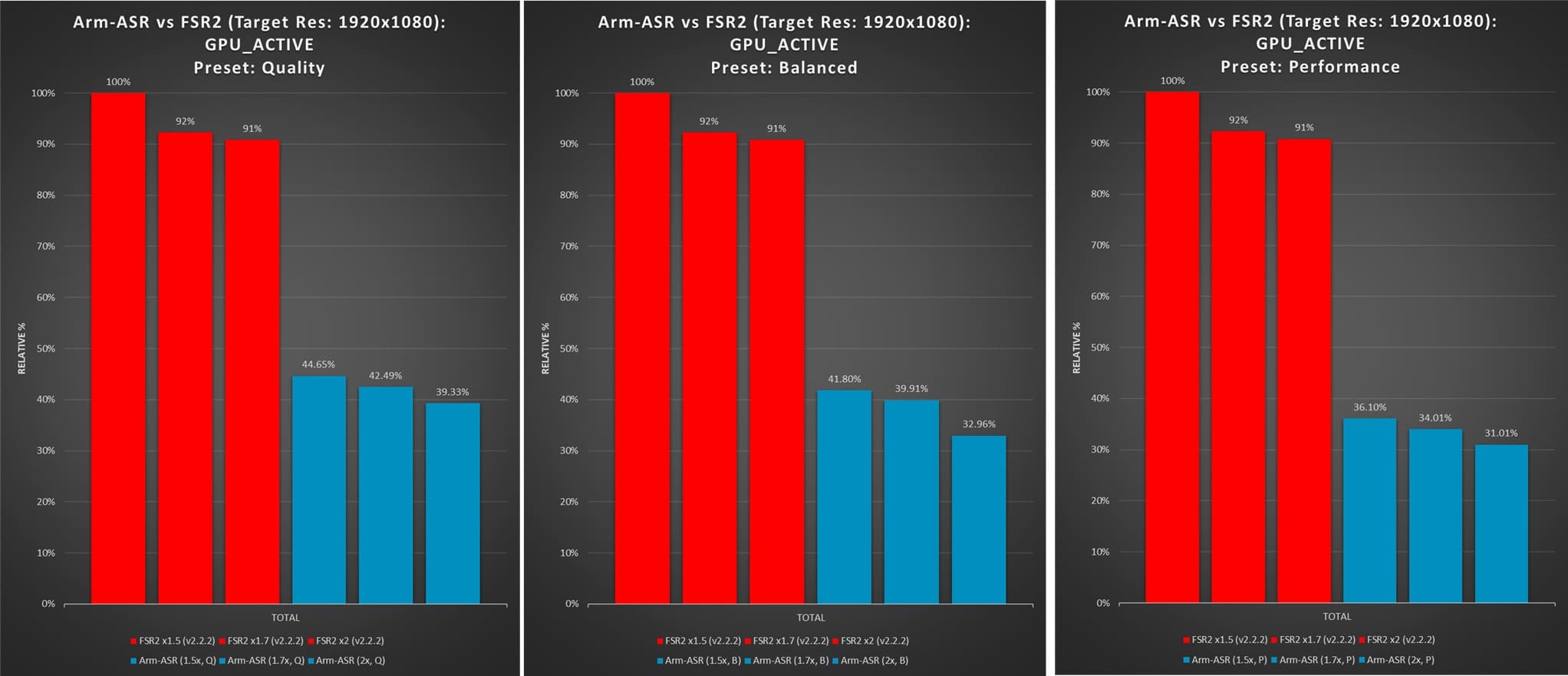 شرکت Arm همچنین برای نمایش عملکرد این فناوری خود نمودارهایی را منتشر کرده است. نتایج نشان داده شده در این نمودارها مربوط به آزمایشی است که با استفاده از هسته گرافیکی Immortalis-G720 و یک صحنه سه بعدی با وضوح 2800 در 1600 پیکسلی صورت گرفته است و همانطور که مشخص است میتوان گفت که فناوری ASR توانسته است عملکرد بهتری را نسبت به فناوریهای FSR 1 و FSR 2 فراهم کند. آنطور که Arm اعلام کرده است در برخی از آزمایشها، فناوری ASR توانسته است حتی 53 درصد بهتر از فناوری FSR 2 عمل کند.