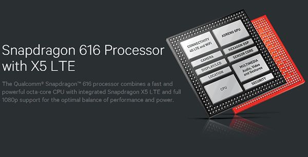 اسنپ دراگون 616 قدرتمندترین تراشه این سری خاص از محصولات کوالکام می باشد و مشخصات آن بر روی کاغذ به اسنپ دراگون 615 نزدیک است. این تراشه دارای چهار هسته پردازشی Cortex-A53 با فرکانس 1.7 گیگاهرتز و چهار هسته پردازشی Cortex-A53 دیگر با فرکانس 1.2 گیگاهرتز می باشد.