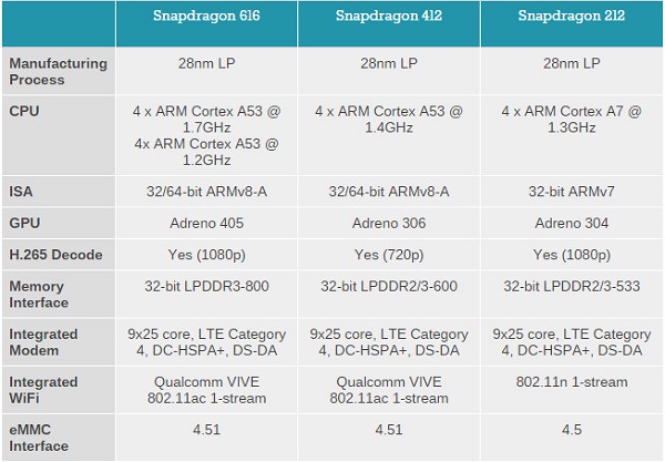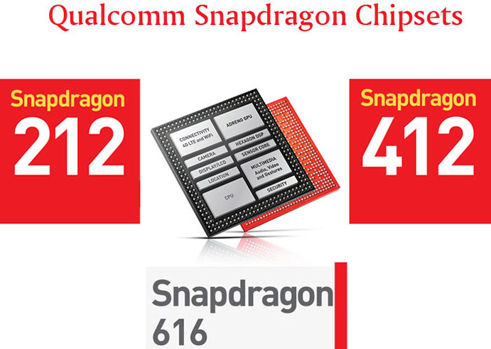 سال گذشه کوالکام از تراشه میان رده اسنپ دراگون 410 و تراشه نسبتاً رده بالاتر اسنپ دراگون 210 با پشتیبانی از شبکه های ارتباطی LTE پرده برداشته بود. اکنون تراشه های اسنپ دراگون 616، 414 و 212، گونه های ارتقا یافته از آنها هستند که کوالکام معرفی کرده است. با این حال بهبود ها خیلی چشم گیر نیستند و برای دست یابی به کارایی بالاتر، می بایست سراغ تراشه های رده بالاتر بروید.