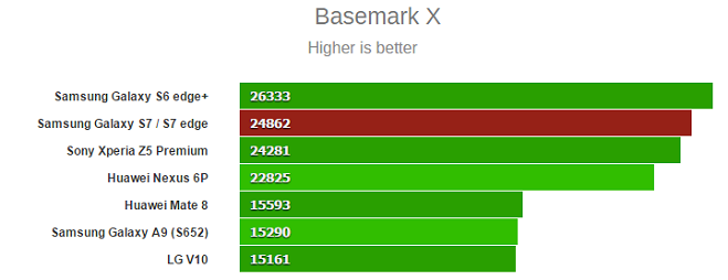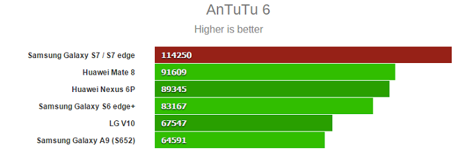 بنچمارک اول AnTuTu 6 است که یک بنچمارک ترکیبی بوده و همه قسمتهای گوشی از پردازنده، پردازنده گرافیکی، حافظه RAM و حافظه ذخیره سازی را با هم به صورت یکجا تست میکند است. در این بنچمارک امتیازات اس 7/اج نشان از قدرت بسیار بالای آن در مقایسه با دیگر رقبا دارد. البته این مورد را در نظر داشته باشید که هنوز بنچمارک قابل اعتمادی از یک محصول با پردازنده و چیپست Snapdragon 820 در دست نداریم.