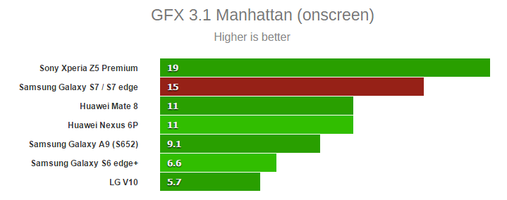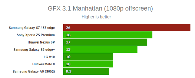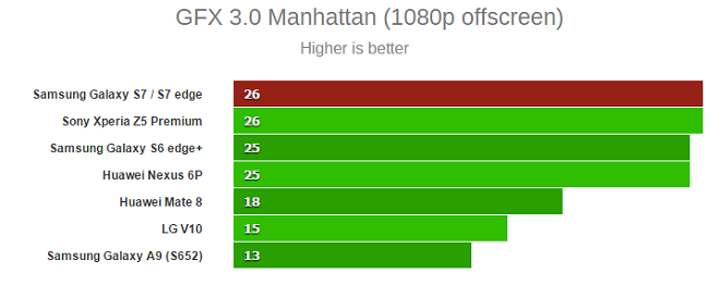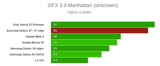 حالا سراغ تست های GPU میرویم. همانطور که میبیند نمایشگر QHD همچنان پاشنه آشیل پردازنده های گرافیکی است؛ اما نکته ی بسیار جالب این است که گوشی Sony Xperia Z5 Premium علی رغم استفاده از نمایشگر 4K در بعضی تست های OneScreen امتیازی بالاتر از S7 کسب میکند. البته نکته بسیار مهم این که در این حالت باید بررسی کرد که تست OneScreen روی Z5 Premium در حالت 1080p انجام میشود یا 4K؟
