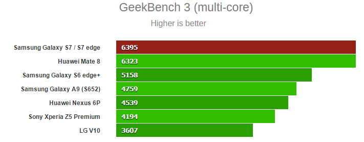 همانطور که بالاتر هم گفتیم سامسونگ سنت شکنی کرده و به مانند کوالکام سراغ توسعه معماری پردازنده اختصاصی خود رفته است. بد نیست تا نگاهی به حاصل کار مهندسین این شرکت داشته باشیم. بنچمارک GeekBench 3 این مورد را به خوبی مشخص میکند (متأسفانه اطلاعاتی درمورد بنچمارک تک هسته ای گوشی Huawei Mate 8 در دسترس نیست)