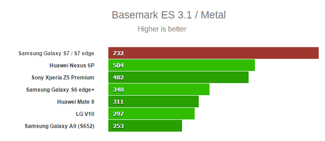 در نهایت هم به مقایسه نتایج تست Basemark ES 3.1 میپردازیم که یک تست OpenGL ES 3.1 است و در این تست ها هم S7 عملکرد بسیار خوبی از خود به نمایش میگذارد.