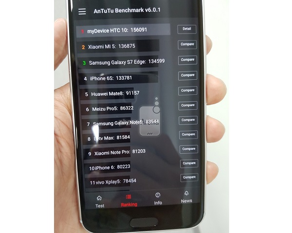 سایت PhoneArena روز گذشته تصویری را منتشر کرد که علاوه بر فاش کردن ویژگی های ظاهری گوشی HTC 10، امتیاز کسب شده توسط این گوشی در بنچمارک AnTuTu را هم منتشر می کند. براساس اطلاعات منتشر شده در این تصویر، پرچمدار سال 2016 کمپانی HTC توانسته است با کسب امتیار 156,000 در بنچمارک AnTuTu، در رتبه ای بالاتر از گوشی های گلکسی اس 7 اج و آیفون 6 اس قرار بگیرد.