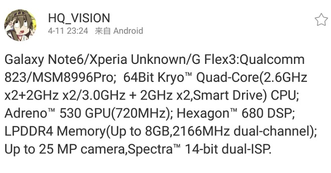 همانطور که گفتیم منبع این شایعات در مورد مشخصات چند گوشی صحبت کرده است؛ گلکسی نوت 6، یک مدل اسمارت فون اکسپریا از سونی که احتمالاً باید رده بالای میان مدت این شرکت باشد و نسخه جدید گوشی انعطاف پذیر الجی با نام LG G Flex 3 از چیپست Snapdragon 823 کوالکام استفاده خواهند کرد. علاوه بر این در مورد گوشی های مورد بحث ما این مورد بیان شده است که از دوربین با رزولوشن 25 مگاپیکسلی نیز بهره خواهند برد.