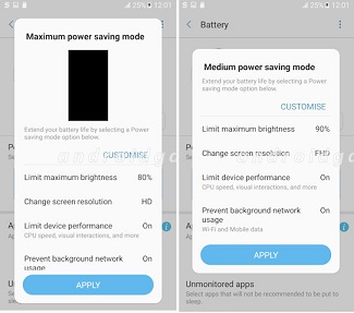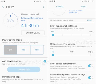 ظاهرا نوت 7 تنظیمی برای حالتهای مختلف power saving دارد که در حالت متوسط، رزولوشن نمایشگر به فول اچدی و در حالت حداکثر حفظ انرژی، به اچدی تغییر خواهد کرد. همچنین امکان تنظیم محدودیت برای حداکثر نور صفحه نیز وجود دارد. سامسونگ حین تغییر رزولوشن به کاربر اطلاع میدهد که بعضی تنظیمات و اپلیکیشنها ممکن است در رزولوشن پایین، به خوبی حالت اصلی عمل نکنند. در مجموع، احتمال میرود که 1080p رزولوشن بهینه و میانهای برای تعادل بین مصرف باتری و تراکم پیکسلی مناسب باشد، اما بهرحال بهتر است منتظر عرضهی رسمی گوشی بمانیم و باتری 3500 میلیآمپرساعتی را در تمام حالات تست کنیم.